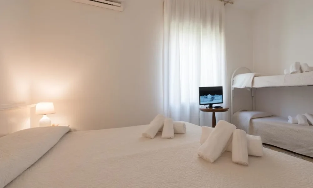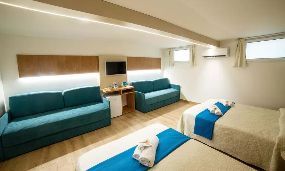 La camera familiare, moderna e completamente rinnovata, si trova al piano seminterrato, ed è dotata di finestre, climatizzatore e deumidificatore. Offre, tra l’altro, un letto matrimoniale, uno alla francese, 2 comodi divani letto, minifrigo, bagno con doppio lavabo e due soffioni doccia. Grazie all’ampia metratura, ospita comodamente una famiglia o un gruppo di amici.