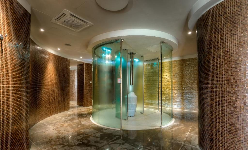 la vasca idromassaggio con vista panoramica, la sauna, caldarium, frigidarium, tiepidarium, doccia emozionale, area relax con tisaneria e un simpatico kit di cortesia.
