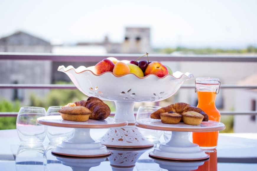 La colazione è servita sulla meravigliosa terrazza da cui si intravede il famoso faro di Santa Maria di Leuca.