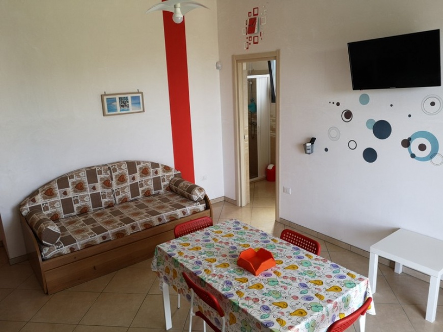- ingresso, 2 camere da letto (la prima con matrimoniale più letto a castello, la seconda con letto doppio e letto singolo), bagno, ampia cucina con tv 32" , terrazzo (quest’ultimo è attrezzato con tavolo e sedie per pranzi e cene all’aperto)