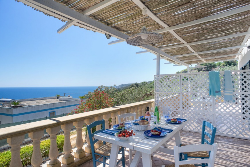 Qualche gradino ci conduce sulla veranda in parte coperta per consentire di consumare pasti all’aria aperta ed in parte scoperta per concedersi una tintarella in tutta privacy.