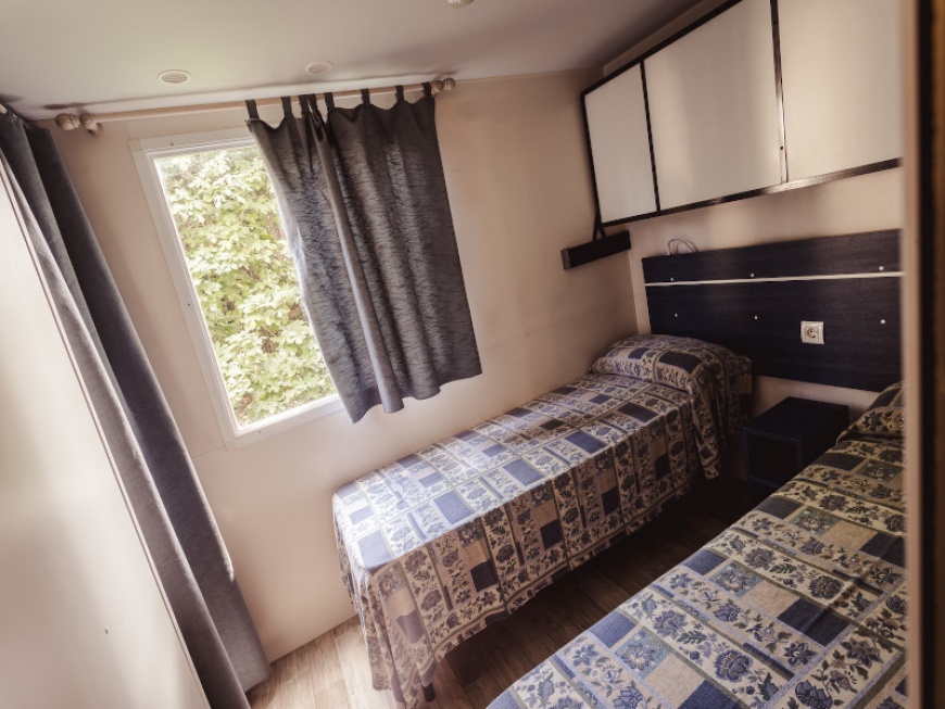 3 camere in muratura matrimoniali con piccolo piano cottura interno attrezzato di stoviglie, finestra e porta finestra con tende, bagno, fornitura elettrica e idrica, aria condizionata, biancheria da letto e da bagno.