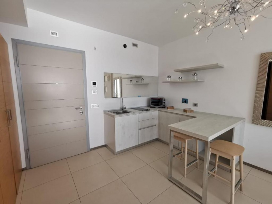 Elegante e moderno appartamento bilocale in affitto con balcone vista mare, sito al terzo piano di un residence a Gallipoli, servito da ascensore.