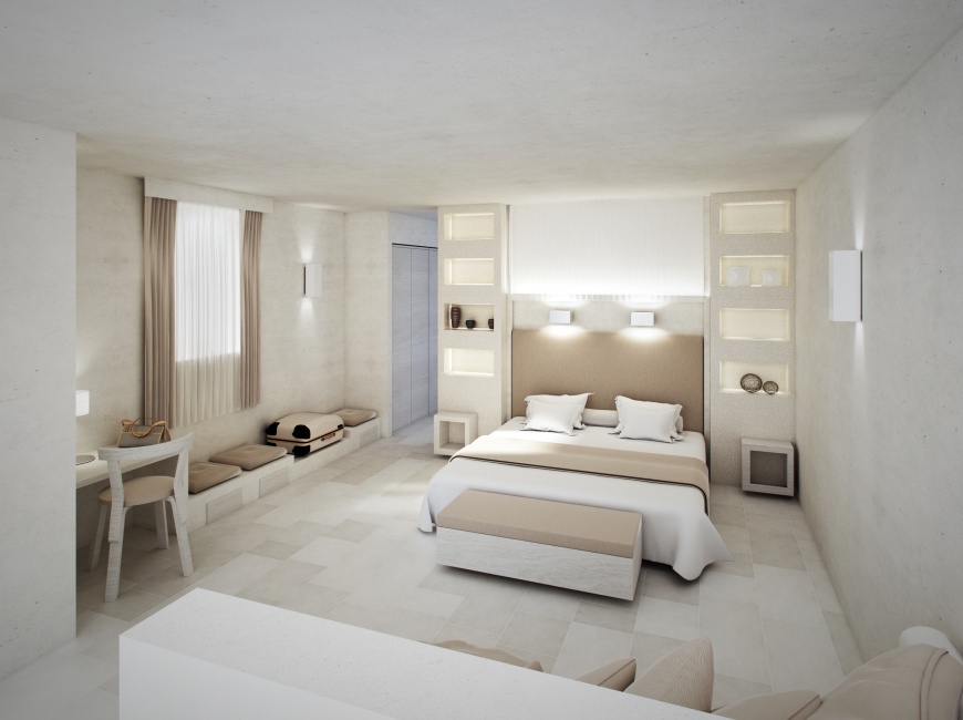 Pareti candide, porte e finestre color verde acqua, pavimento in pietra di Trani, letti in tessuto ignifugo che richiama il lino, divani in tufo con grandi cuscini, mobili in legno realizzati da un’azienda artigiana, biancheria in cotone e bagni in pietra con ampia doccia.