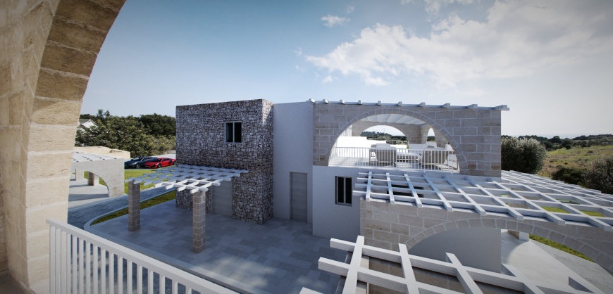 All’esterno pergolati con colonne di tufo e cannucciato.