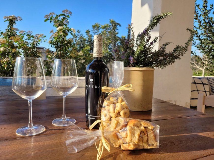 Nel patio esterno della Masseria vicino castro marina nella costa adriatica nel Salento, sono presenti un forno a legna in pietra leccese e un barbecue dove si possono organizzare, su richiesta e con supplemento, delle serate a tema e cooking experience con degustazione di vini e piatti tipici locali a km0 in completo rispetto della natura.