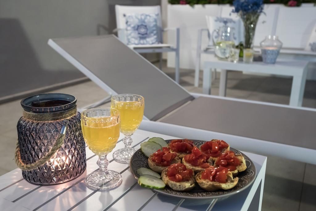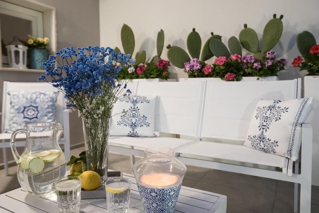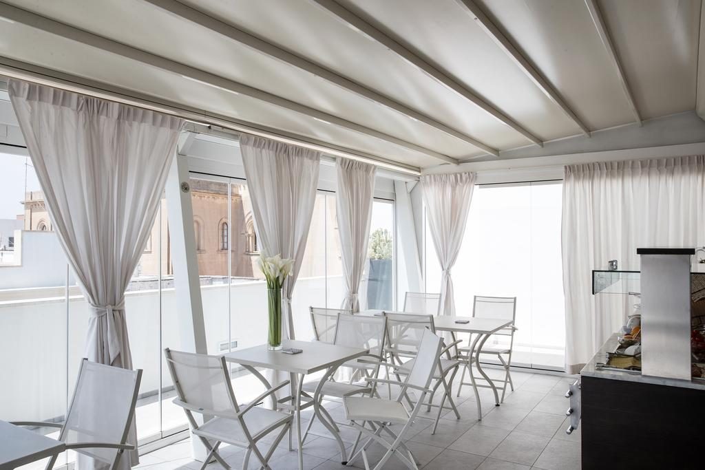 La bellissima terrazza, dove viene servita la colazione, è un’oasi di relax arredata con salottini e lettini prendisole.