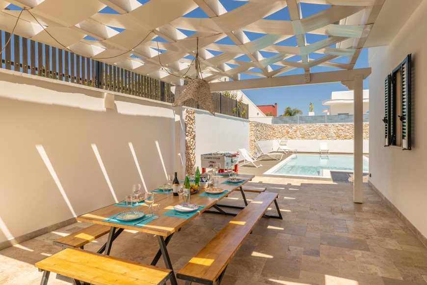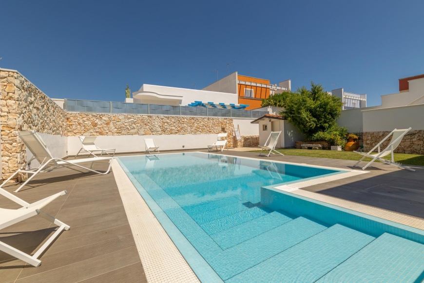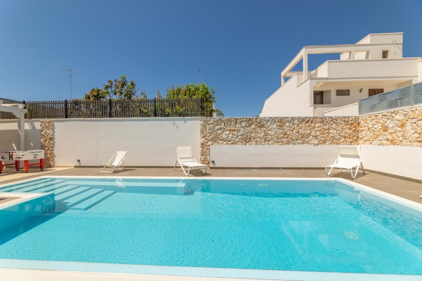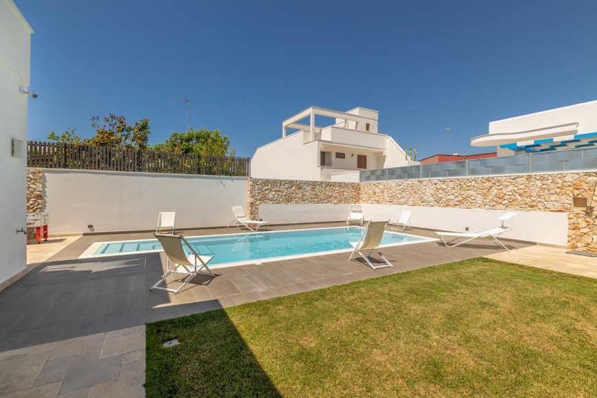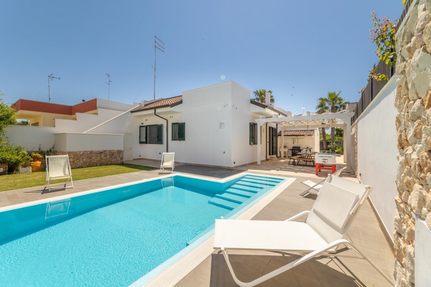 Questa villa con piscina, ideale per 6-10 persone a Boncore (Torre Lapillo), vicino alle spiagge più belle del Salento, può ospitare un gruppo di amici in vacanza in Salento.