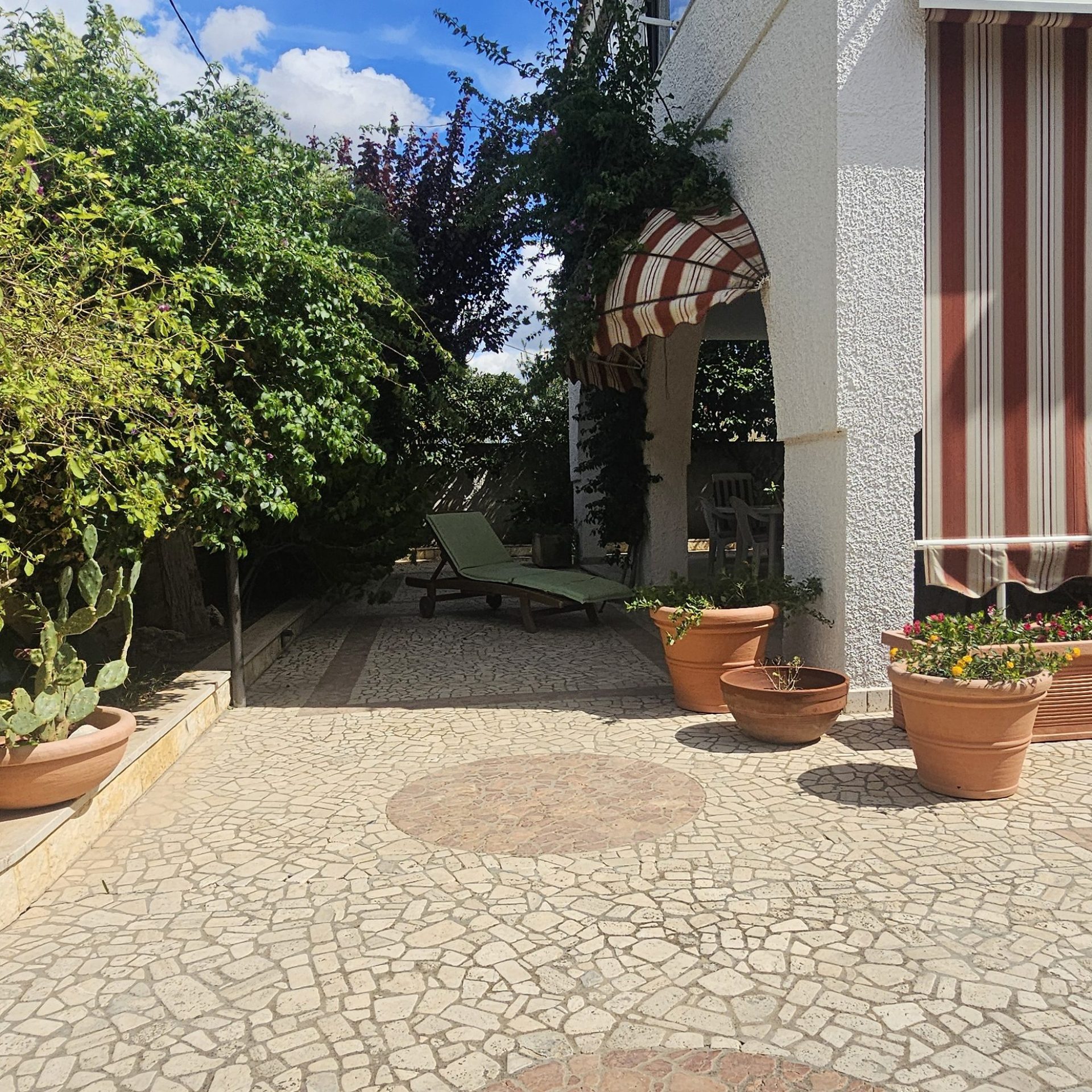 Grande veranda attrezzata con arredamento da giardino, salottino e sdraio