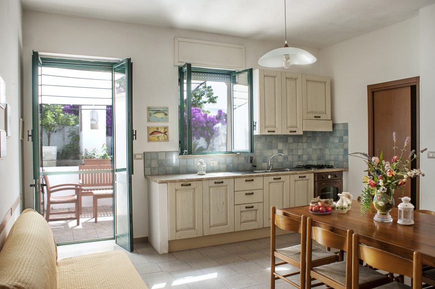 La villetta in affitto a Santa Cesarea terme è composta da grande soggiorno – pranzo, con divano letto biposto e annesso angolo cottura.